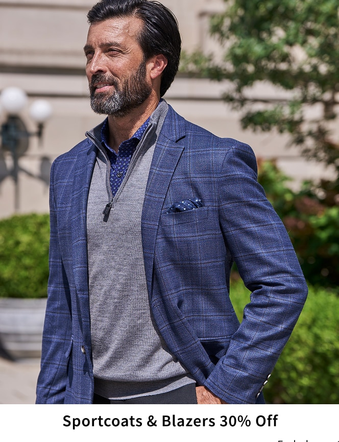 SPORTCOATS AND BLAZERS 30% OFF: Discount taken off regular price. Additional charge for Big & Tall sizes. Select styles, sizes and colors. Excludes Johnston & Murphy Collection. Ends 2/4/2026 11:59 p.m. CT.