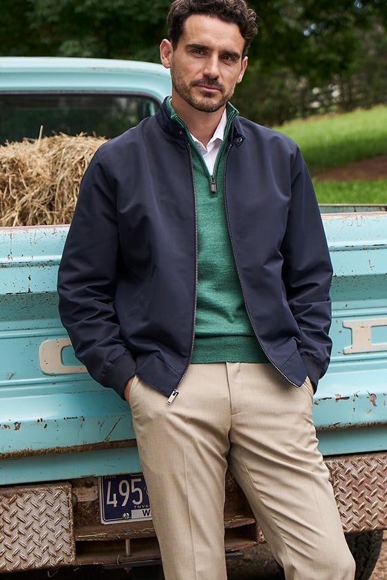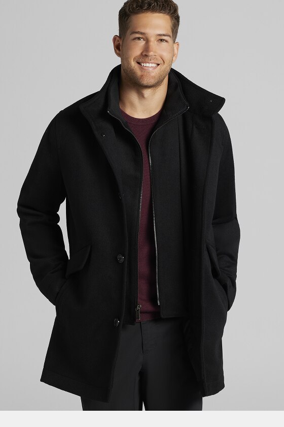 Crafted from a soft melange fabric, this Jos. A. Bank short overcoat delivers classic style with a modern edge. Its tailored silhouette layers effortlessly over suiting or casual looks, while the subtle texture adds depth and interest. Designed for versatility and warmth, it's a polished go-to for cooler days.